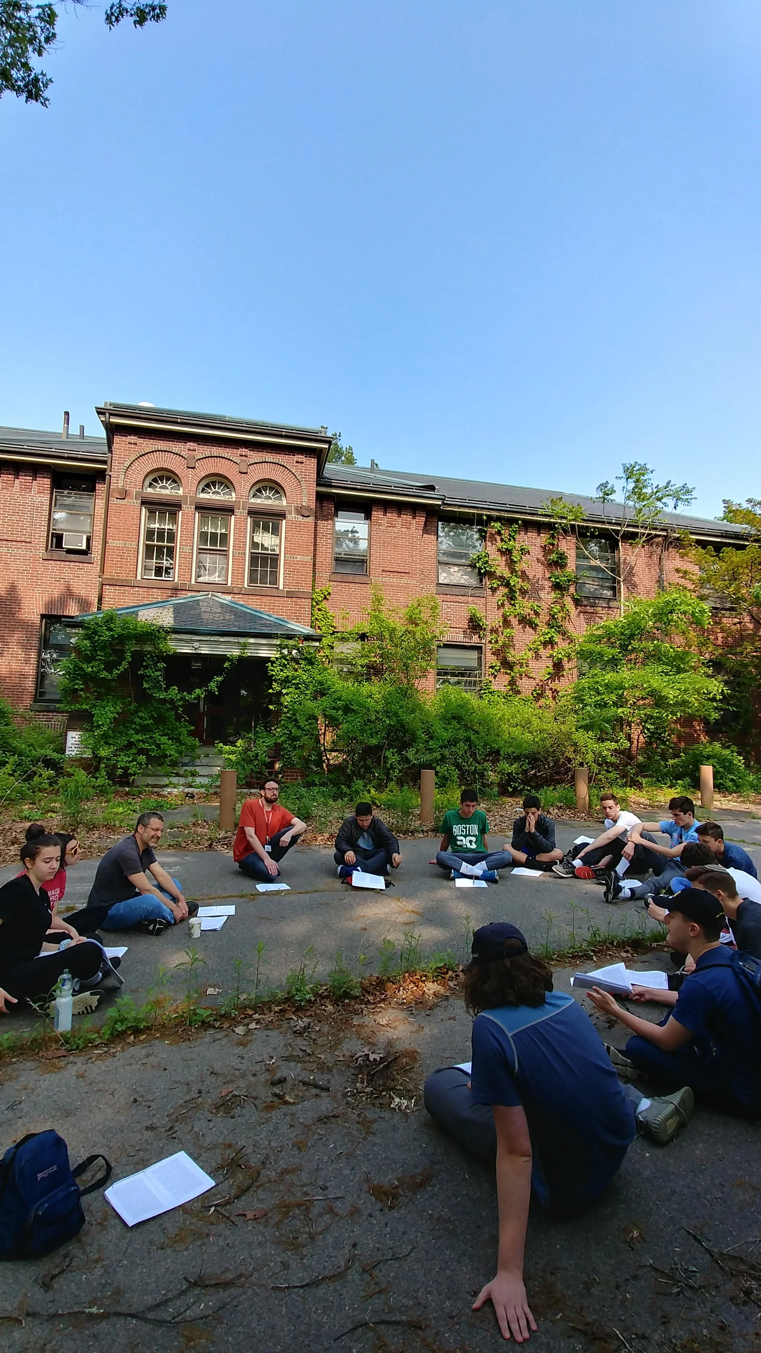 Students sit outside one of the decaying buildings of the Fernald School. We discussed whether or not the institution should be preserved, and if so, why and how. We compared and contrasted other sites we visited. Each had once been in a state of decay and is now preserved. What would we want for the Fernald School? What would we want to avoid? Click the image above to see the complete itinerary of the whole Sacred Space journey.