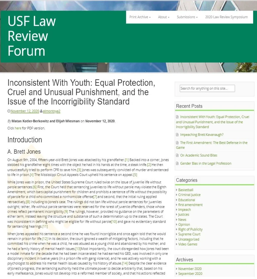 Two seniors wrote an article arguing for a change to sentencing guidelines for minors. It was published in the University of San Francisco Law Review. Click here or on the image above to read their essay.